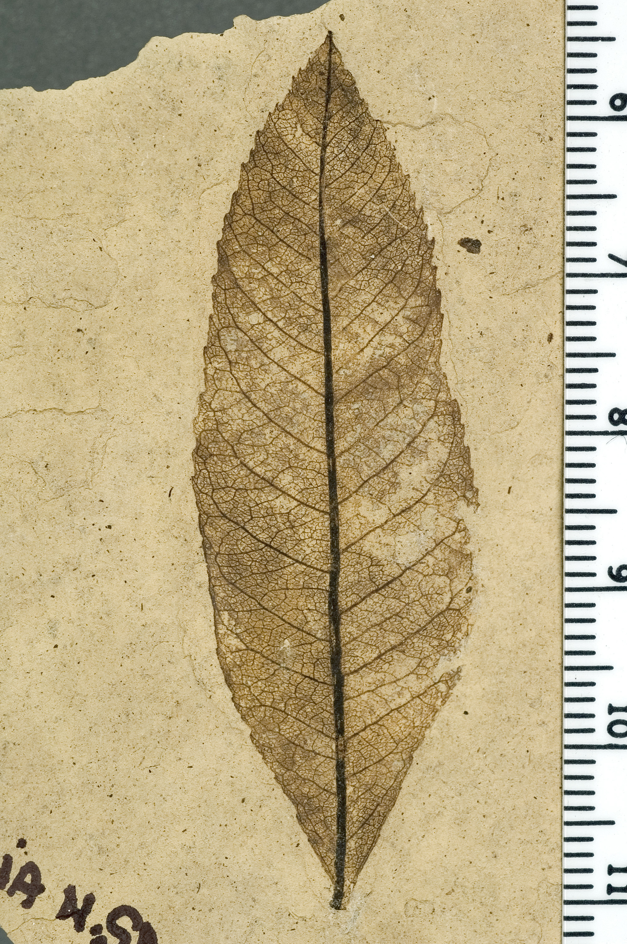 Leaves narrowly ovate to elliptic. Apex acute. Strong pinnate primary vein, semicraspedodromous secondary veins with occasional intersecondaries. No agrophics. Irregularly fine toothed margin.