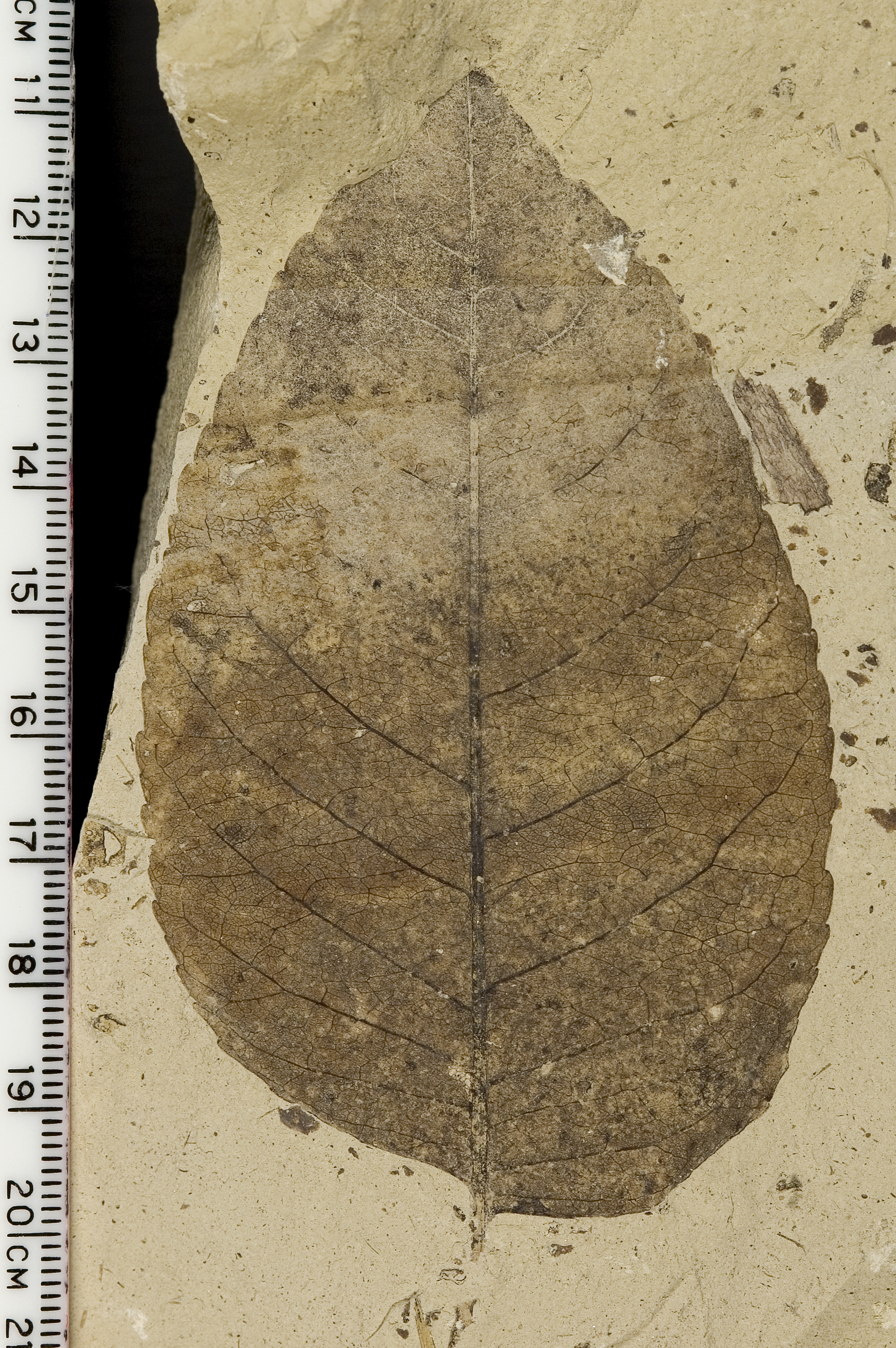 Simple leaf with pinnate primary vein, semicraspedodromous secondary veins. Ovate shape with asymmetric base. Toothed margin.