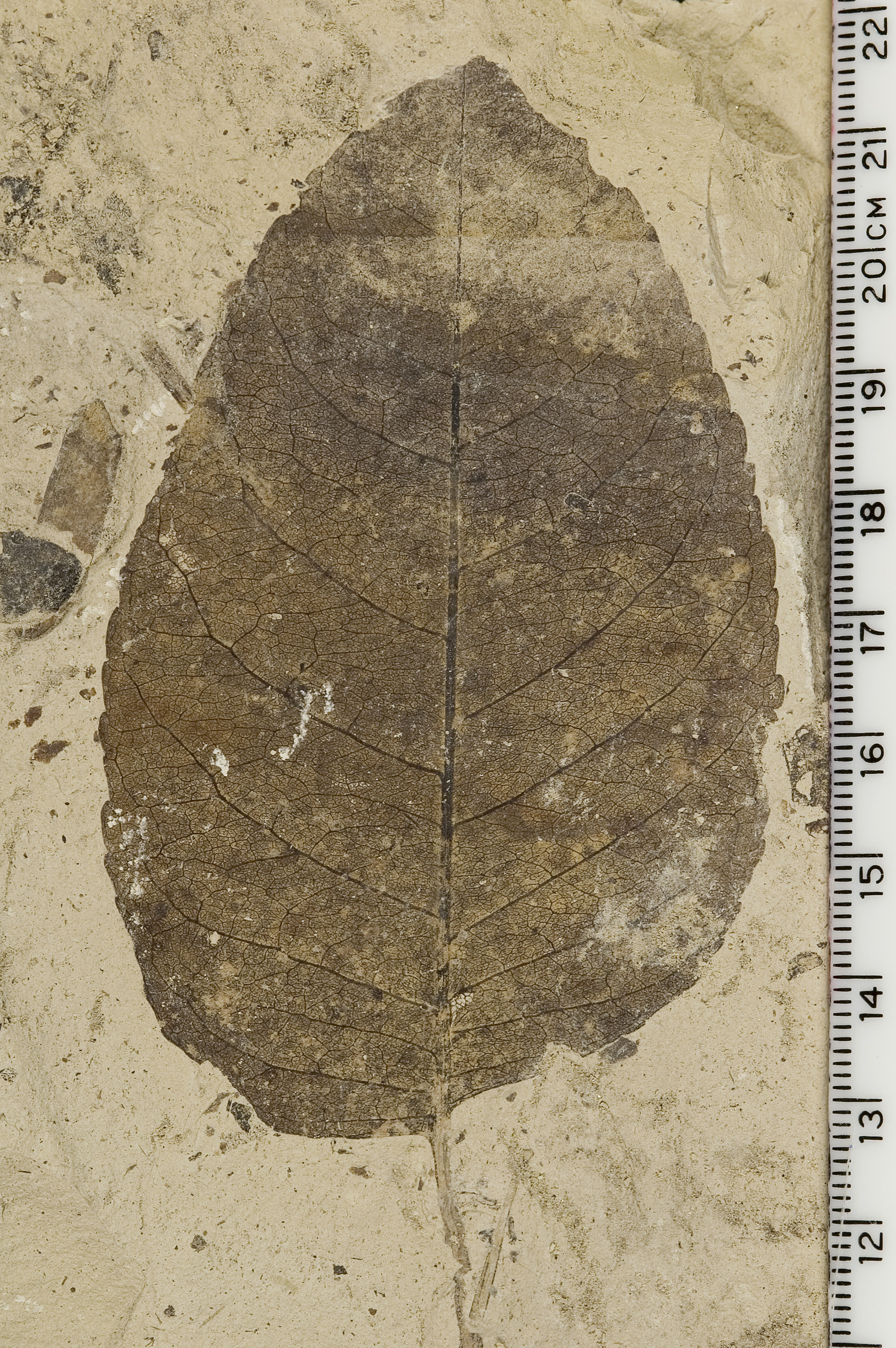 Simple leaf with pinnate primary vein, semicraspedodromous secondary veins. Ovate shape with asymmetric base. Toothed margin.