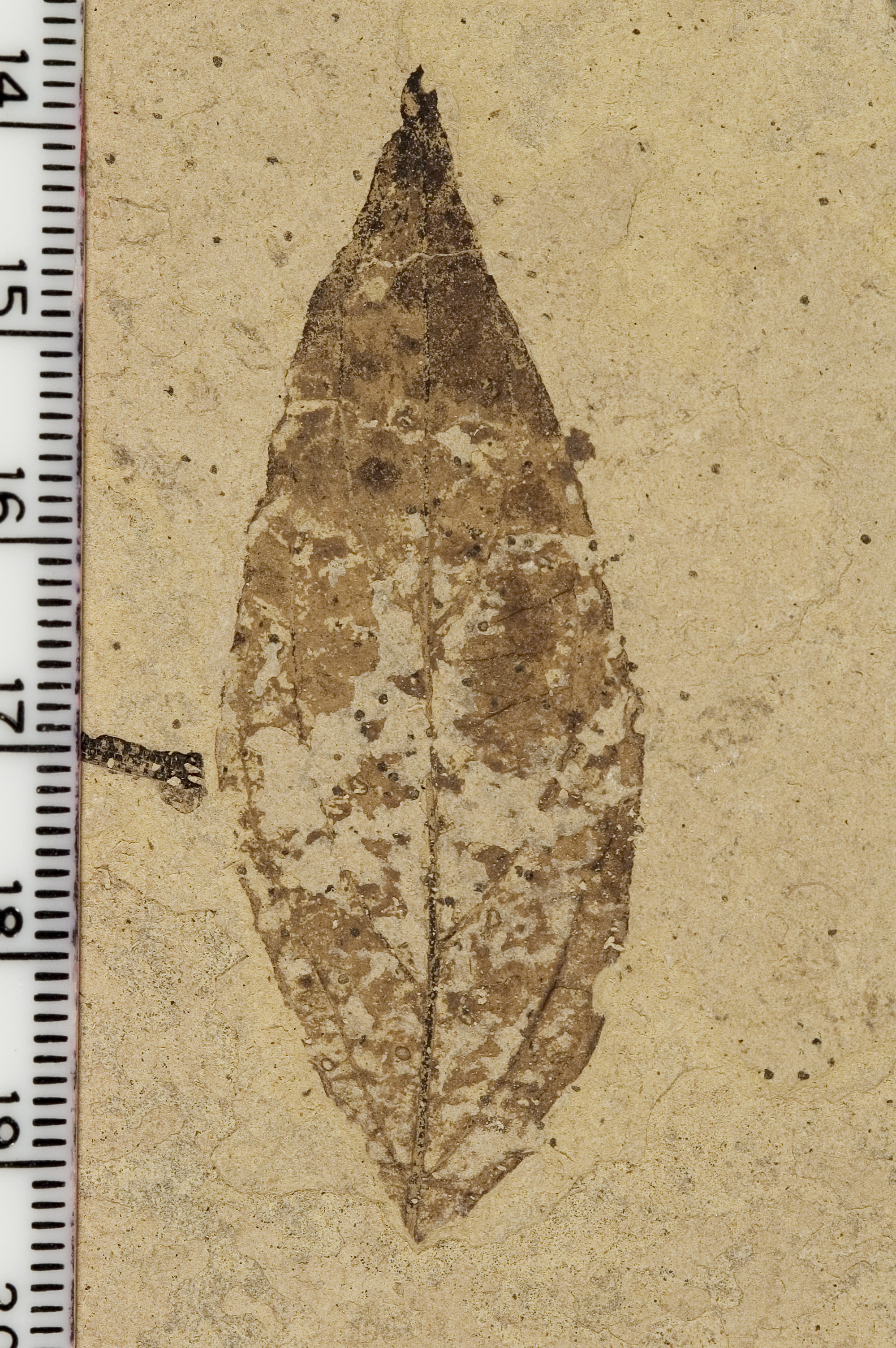 Simple narrowly elliptic leaves with pinnate primary vein and steeply angled secondary veins. Apex acute to acuminate. Margin appears entire.